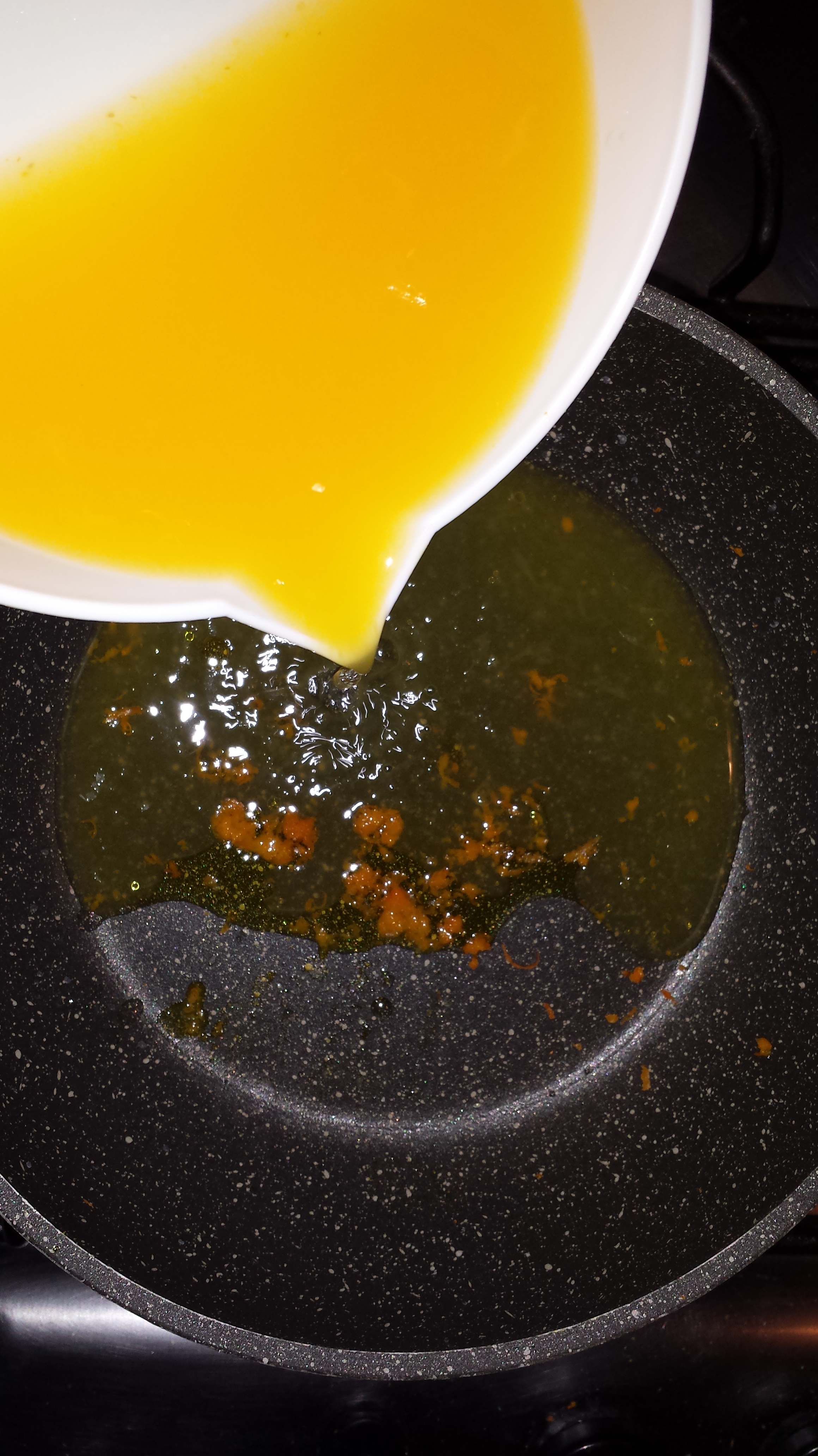 Grattugiare in una padella la buccia delle arance (stando attenti a non grattugiare anche il bianco che è amarognolo) e spremere le arance. In una padellina far rosolare la buccia delle arance in un cucchiaino di olio.