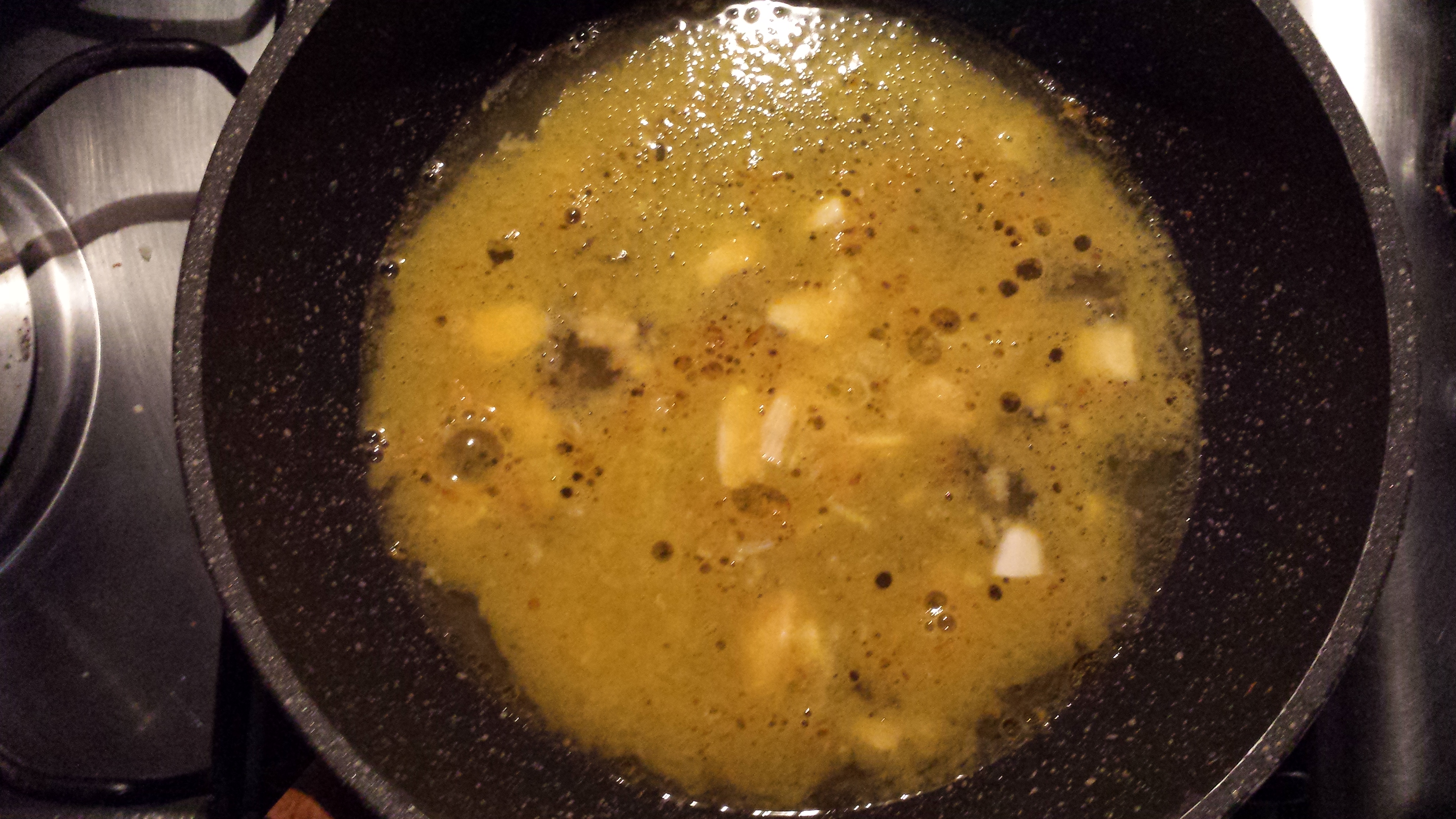 Aggiungere il sughetto con le mandorle al petto di pollo e far cuocere per qualche minuto.