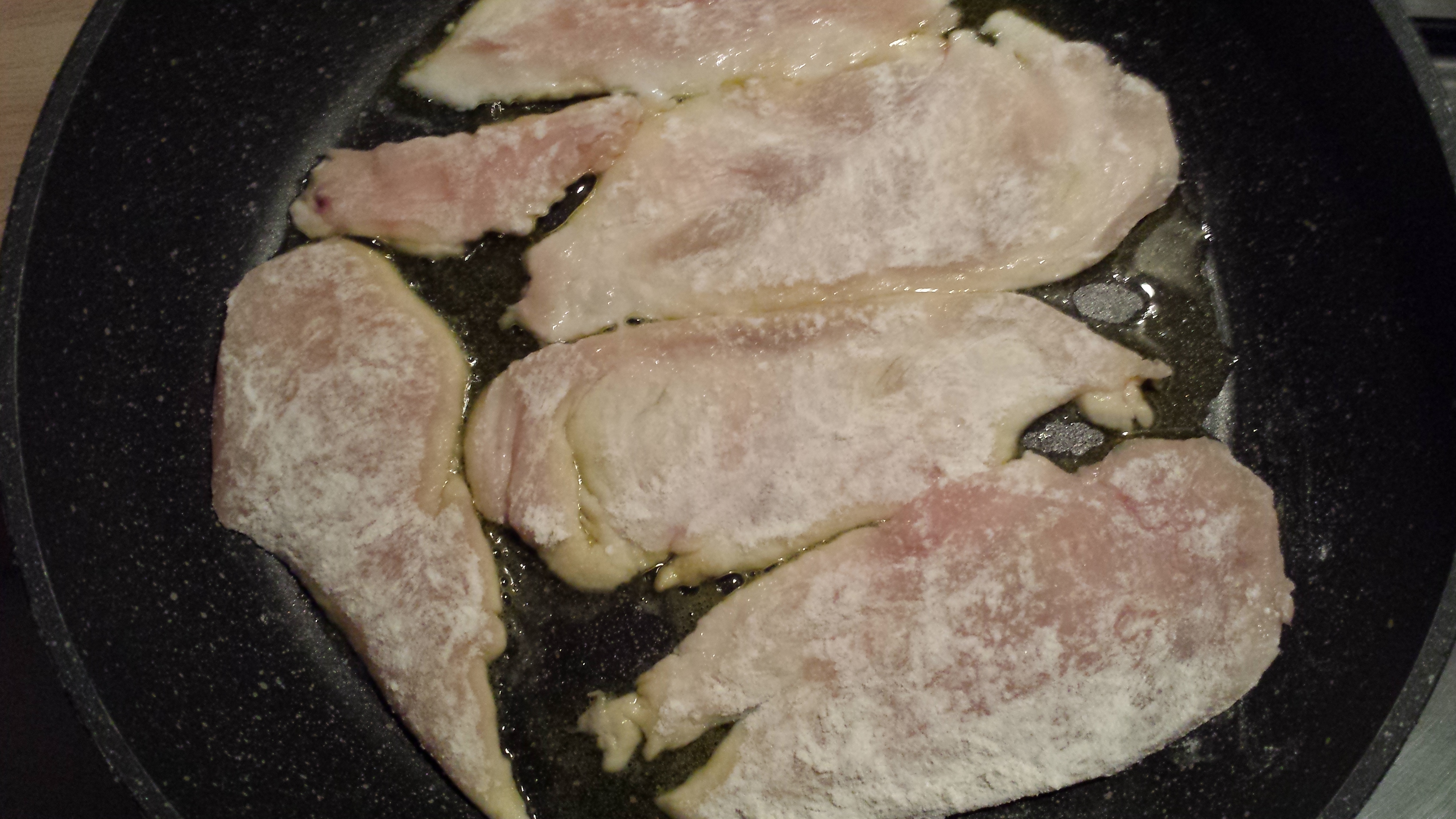 Infarinare il petto di pollo e farlo rosolare da ambo i lati in due cucchiai di olio evo. Salare.