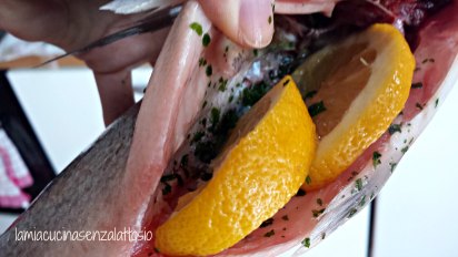 Pulite l’orata (il branzino o la spigola) senza squamarla, evisceratela, sciacquatela sotto acqua corrente e riempitene l’interno con fettine di limone e prezzemolo.