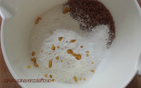 A parte setacciare la farina e aggiungerla (insieme allo zucchero, al lievito, al sale e alla scorza di limone) all’impasto liquido, ed amalgamare il tutto.