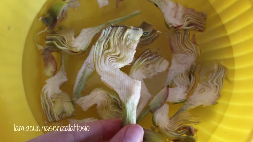 Pulire e tagliare i carciofi a listarelle sottili e riporli in acqua e limone.