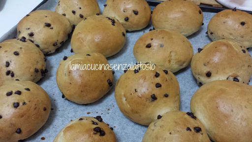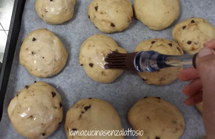 Lasciar lievitare per un’ora: quando le palline saranno raddoppiate di volume spennellare la superficie con un pò di acqua e zucchero (o con del latte delattosato/vegetale) ed infornare in forno preriscaldato a 180° per circa 15 min (la superficie si deve dorare).