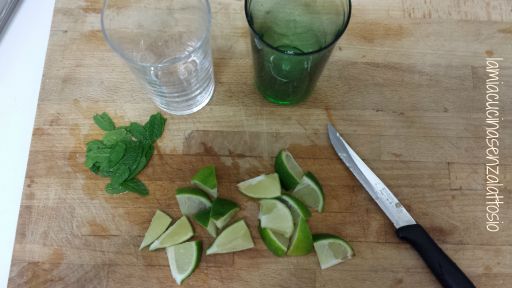 Sciacquare per bene le foglie di menta e tagliare il lime a spicchi.