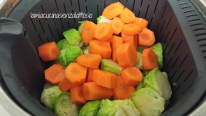 Nel frattempo lavare e pulire le carote, tagliarle a rondelle ed aggiungerle ai cavoletti, continuando a cuocere a vapore per altri 7 min