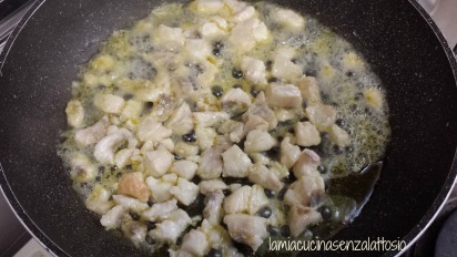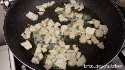 Aggiungere vino bianco fino a coprire il fondo della padella e farli evaporare tutto alzando la fiamma