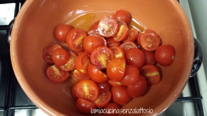 Far imbiondire uno spicchio di aglio in poco olio ed aggiungere i pomodorini e sale, far cuocere il sugo per 10 min
