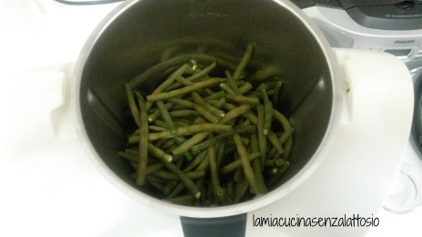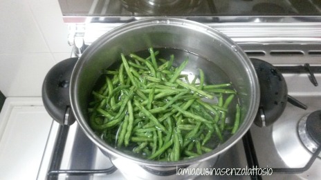 Pulire e lavare i fagiolini. Sbollentarli in acqua salata