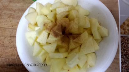 Lavare e sbucciare le mele. Tagliarle a cubetti e mescolare al limone ed alla cannella