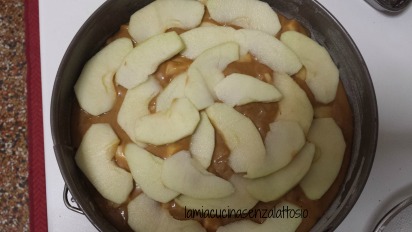 Distribuire nello stampo a cerniera oliato ed infarinato e decorare con le mele tagliate a fettine sottili