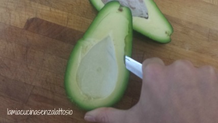 Dividere l’avocado in due, togliere il nocciolo e scavarne la polpa.
