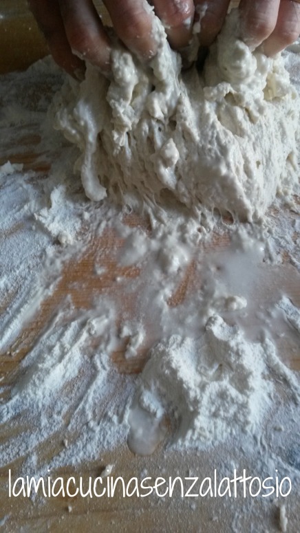 Amalgamare farina e pasta madre fino ad ottenere un panetto molto appiccicoso