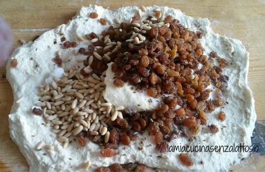 pandolce senza lattosiodolce arricchito con canditi e uvetta; è simile al panettone, ma in realtà non ha nulla a che fare con quest’ultimo ed è conosciuto in America come “Genoa cake”. Esiste i due versioni (quella alta fatta con il lievito madre  e quella bassa fatta con il lievito chimico) e andrebbe servito su una foglia di alloro come buon augurio. Quest’anno per me il pandolce è stata una “sorpresa”: essendo a base di burro è per me off limits ma, quando la nonna di mio marito ha scoperto che avevamo in casa della pasta madre, si è organizzata con il nipote e hanno impastato insieme senza dirmi nulla, per farmi una sorpresa il giorno di Natale, e mio marito ha fotografato passo passo il procedimento per condividere la ricetta sul blog… in realtà le foto sono state intercettate e quindi la sorpresa è arrivata qualche giorno prima! Ordunque quest’anno… pandolce anche per me!!!