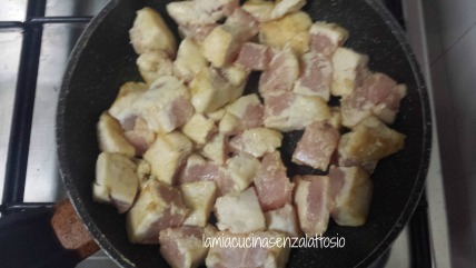 Tagliare il petto di pollo a cubetti, infarinarlo, e rosolarlo da tutti i lati in padella con l’olio.