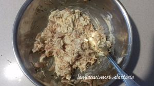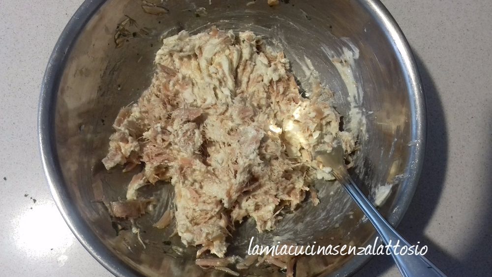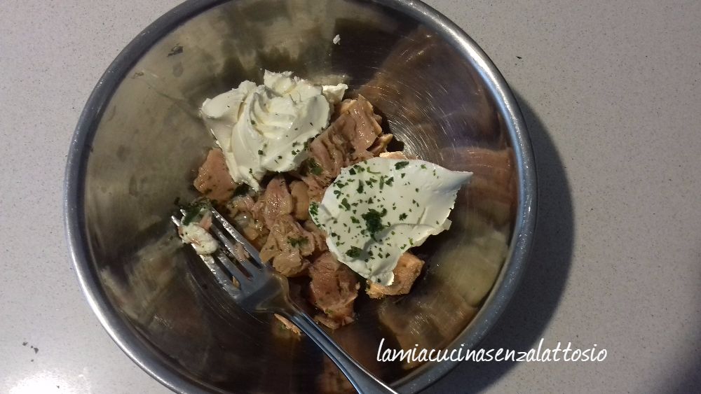Amalgamare il tonno con il formaggio, il sale, un goccio d’olio, un pizzico di sale ed una manciata di prezzemolo fino ad ottenere una crema.