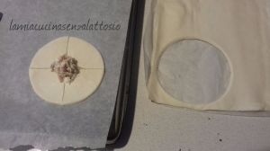 Ritagliare con un coppapasta un disco dal diametro di circa 10 cm e riporvi al centro un cucchiaino di ripieno. Con un coltellino praticare 4 incisure nel disco partendo dal ripieno a 90° una rispetto all’altra.