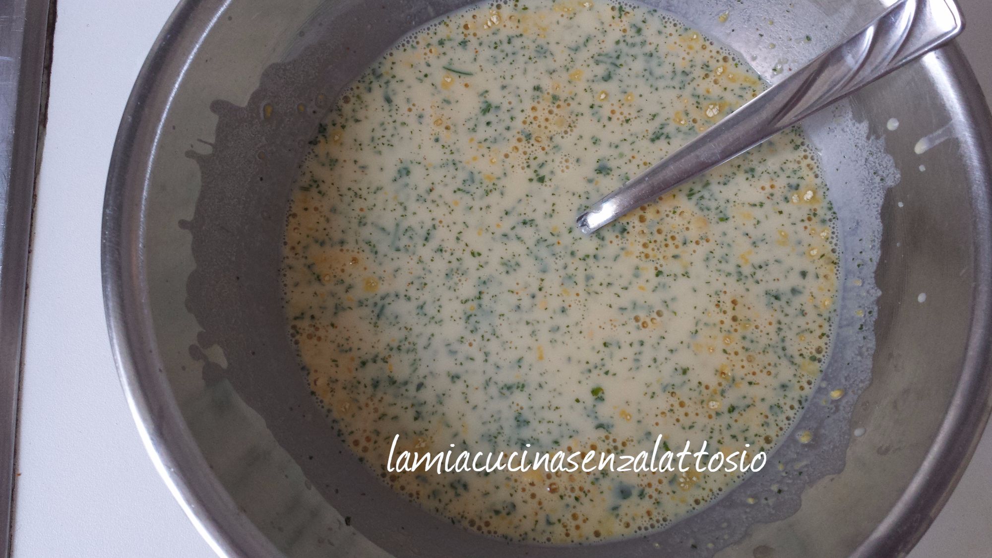 Preparare la pastella con la farina di ceci, il latte vegetale, il prezzemolo ed il sale