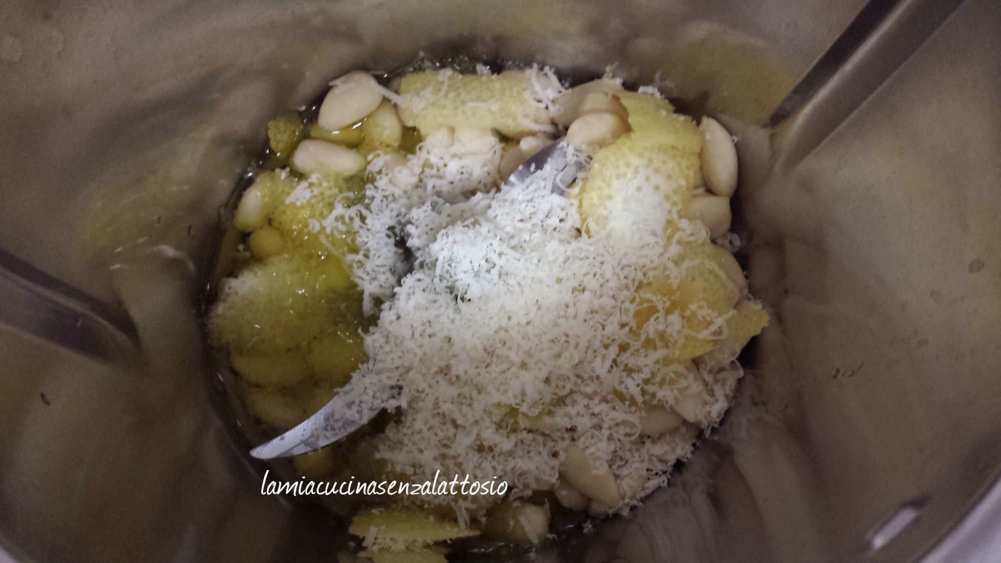 Riporre nel mixer le mandorle, il succo di mezzo limone, le scorze del limone bio (senza la parte bianca), il parmiggiano, l’olio, 1 pzc di sale, 1 cucchiaio di acqua di cottura e frullare il tutto fino ad ottenere una crema. (regolare la densità eventualmente aggiungendo altra acqua di cottura.