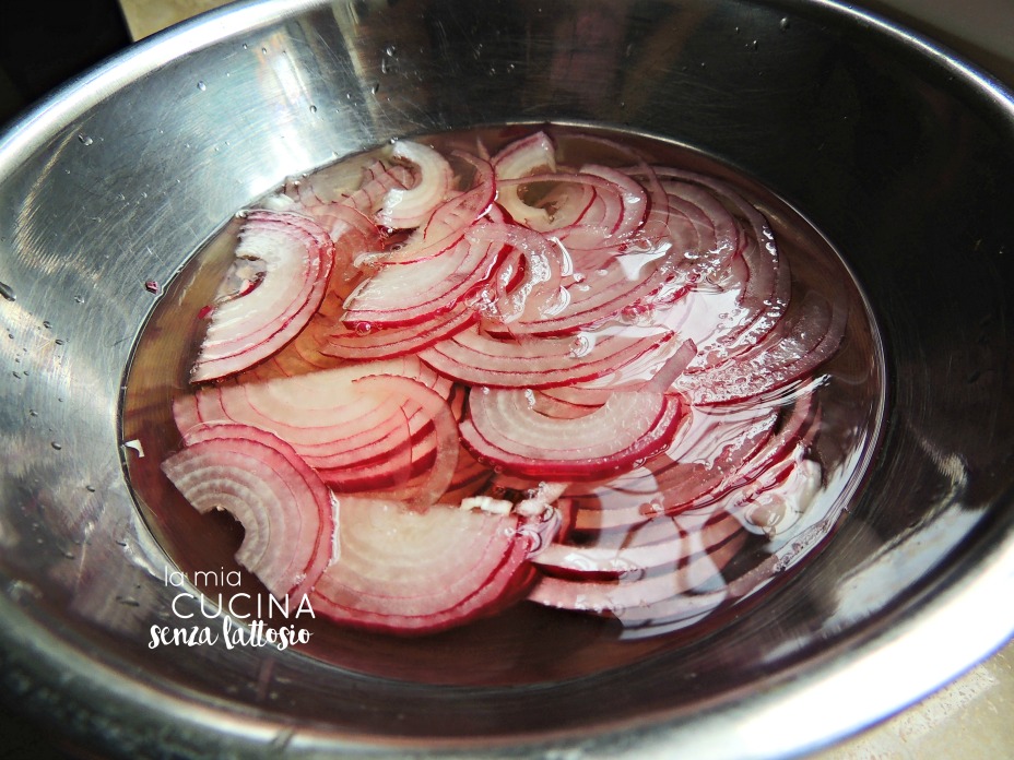 Tagliare la cipolla a spicchi finissimi e mettere in ammollo in una ciotola con 1/3 di aceto e 2/3 di acqua per 30 min