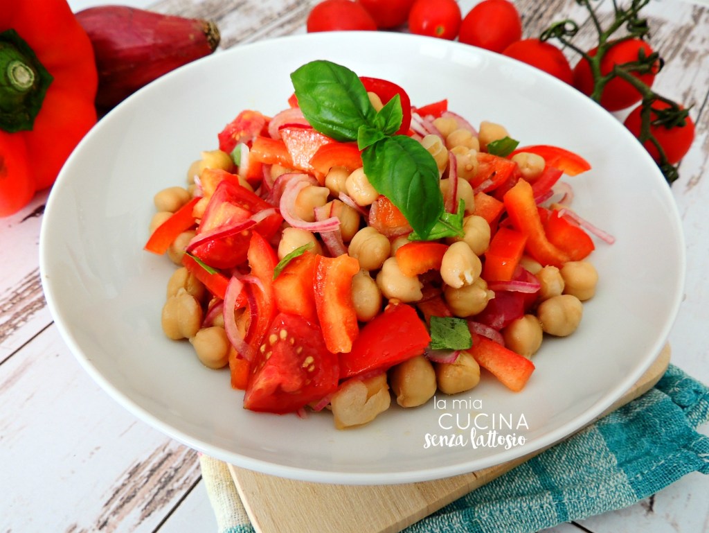 Trascorsi i 30 min scolare le cipolle e i peperoni, unirli ai ceci ed ai pomodorini. Condire con poco sale, abbondante olio evo e foglioline di basilico.
