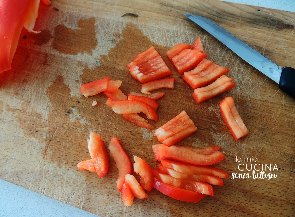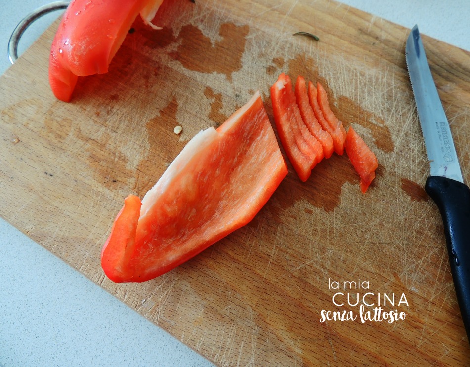 Sciacquare il peperone, ripulirlo della parte interna e delle venature bianche, tagliarlo a rettangoli sottili ed unirlo alla cipolla