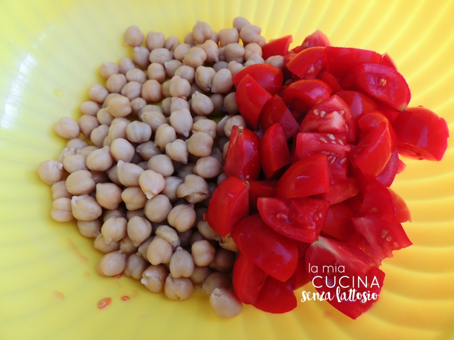 Sciacquare i ceci sotto acqua corrente abbondante e tagliare i pomodorini a spicchi