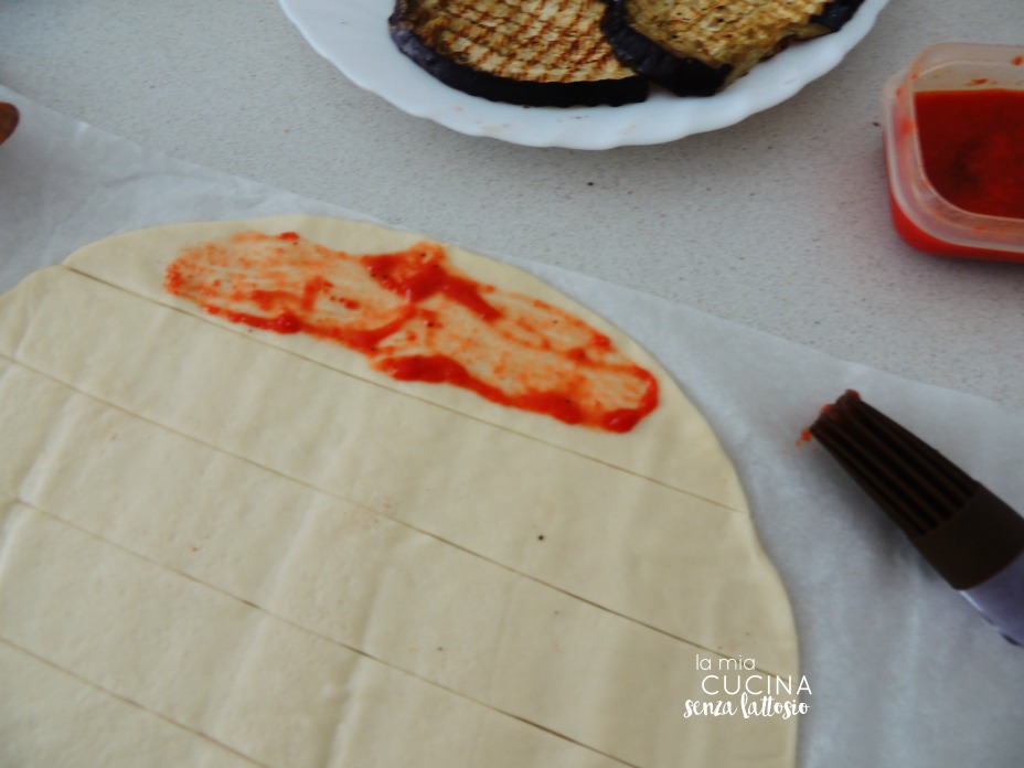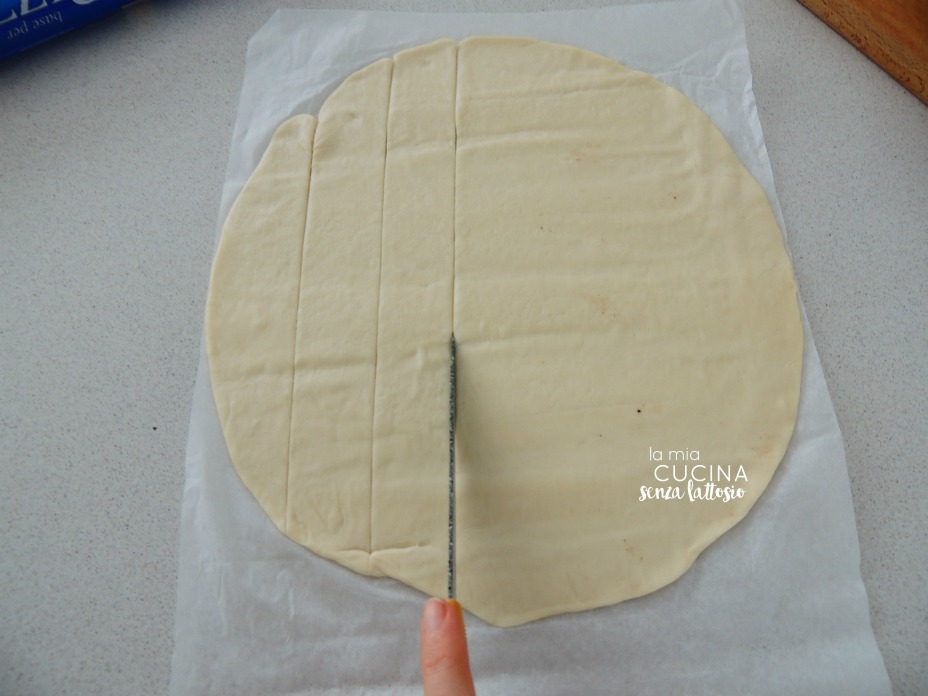 Tagliare la sfoglia a strisce di circa 4 cm di larghezza (verranno 7 strisce)