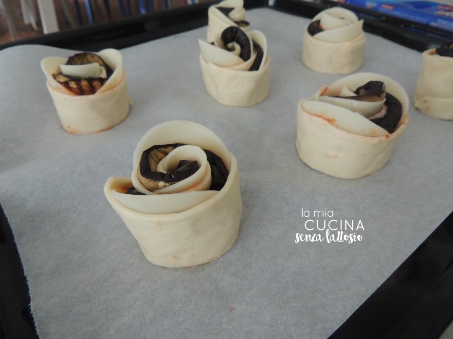 Arrotolare le striscioline da sinistra verso destra dando la forma della rosa (assicurarsi di sigillarle per bene in modo non si aprano durante la cottura)