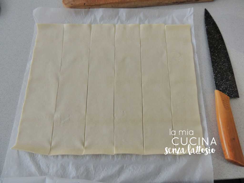 Tagliare ogni sfoglia in 6 strisce uguali tagliando parallelamente al lato corto