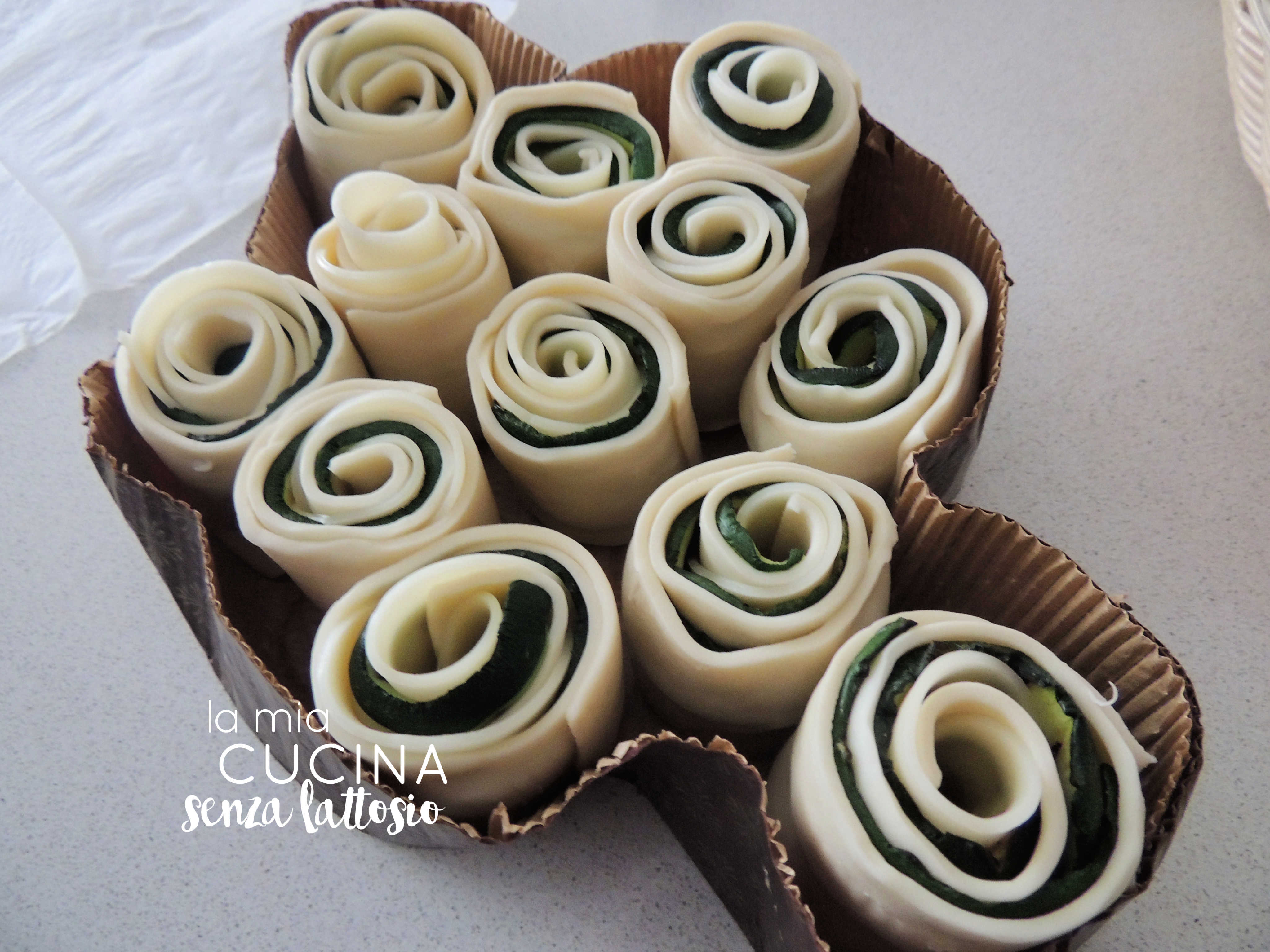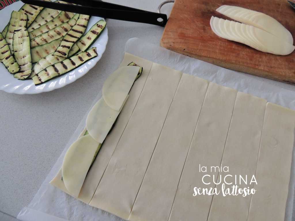 Farcire le strisce uno strato di zucchine ed uno di scamorza, lasciando un’estremità libera da farcitura (servirà per sigillare la rotella di sfoglia)