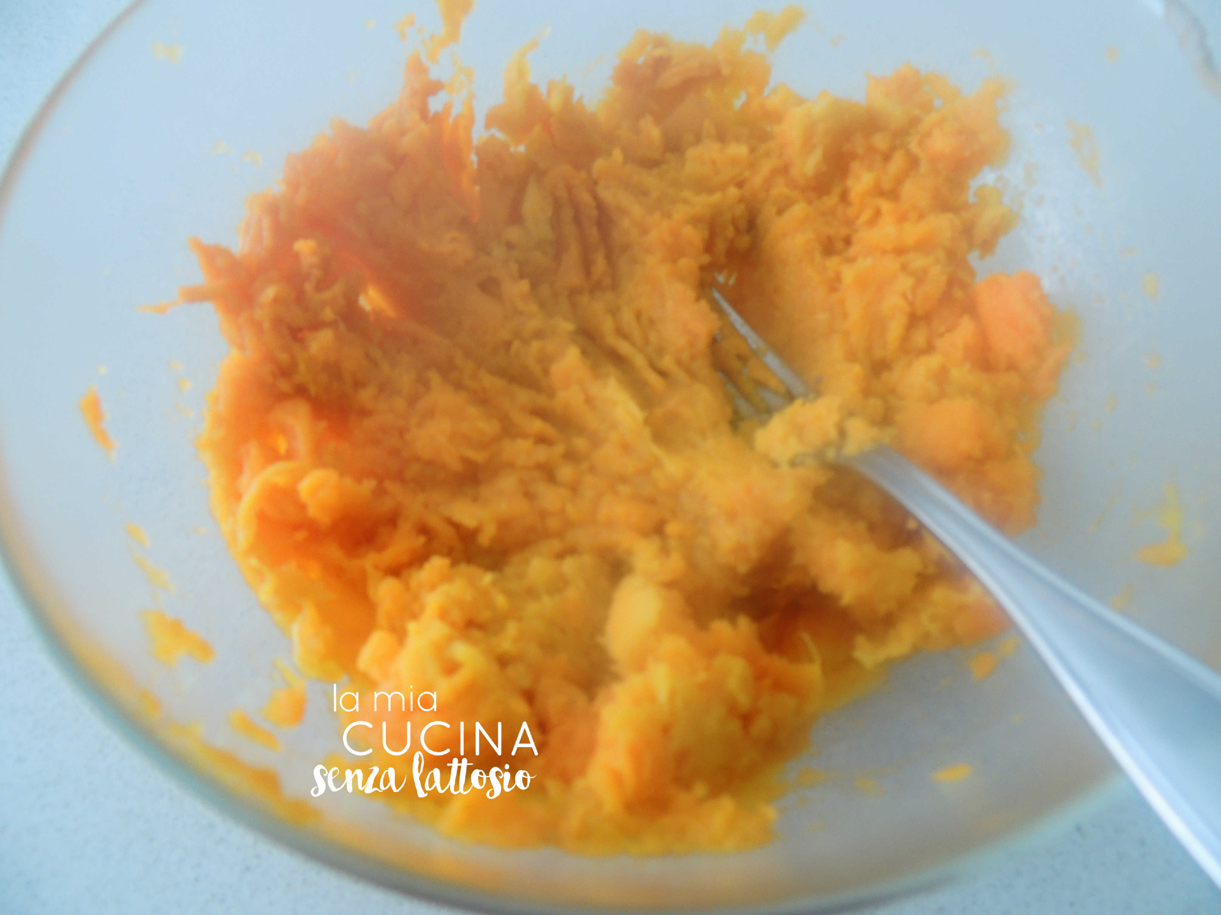 Bollire le patate fino a che non si infilzano facilmente con la forchetta. Sbucciarle e schiacciarle con la forchetta fino a ridurle in purea