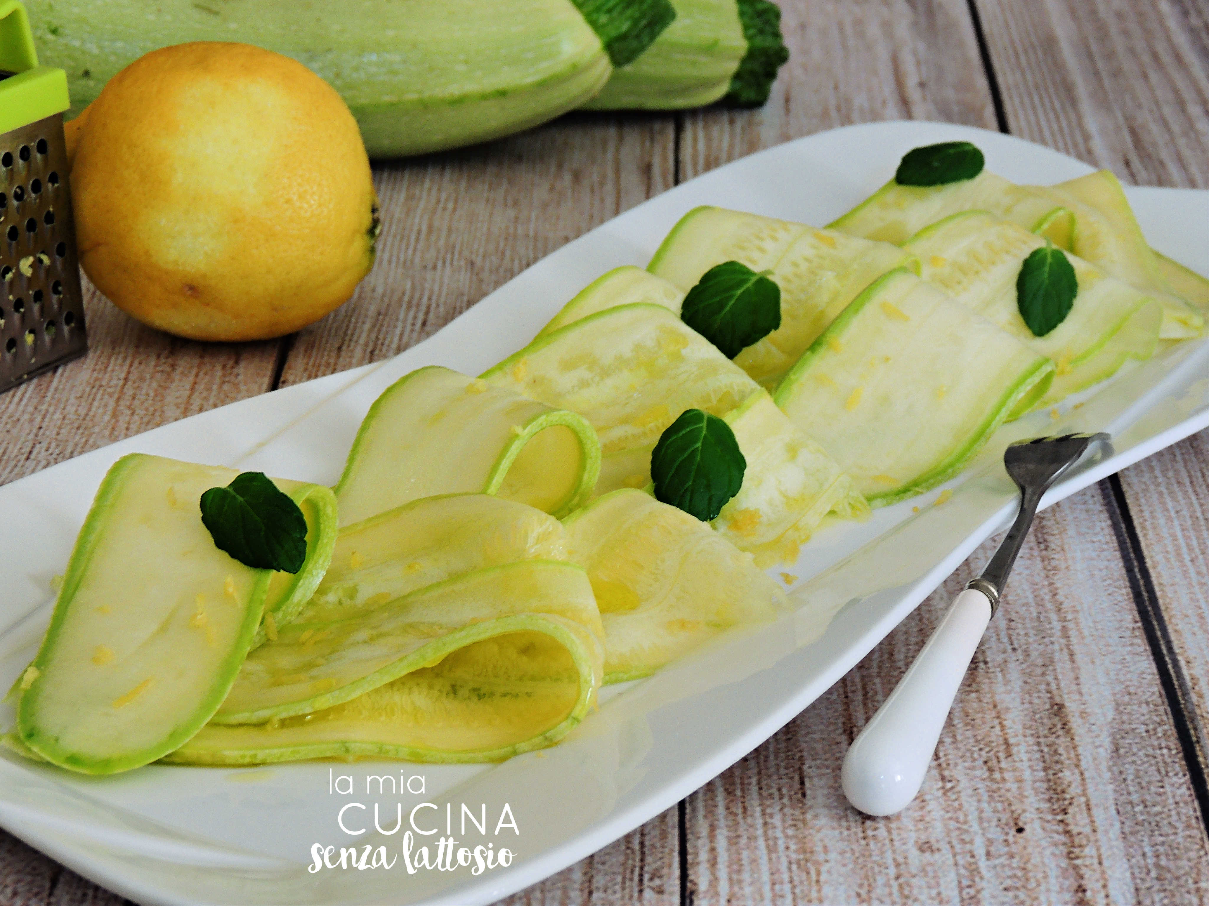 Lavare le zucchine per bene e tagliarle di lungo formando delle fette sottilissime. Condirle con un pizzico di sale, un filo di olio, tanto succo di limone,  buccia di limone grattugiata e foglioline di menta. Lasciare riposare in frigo qualche ora e servire.