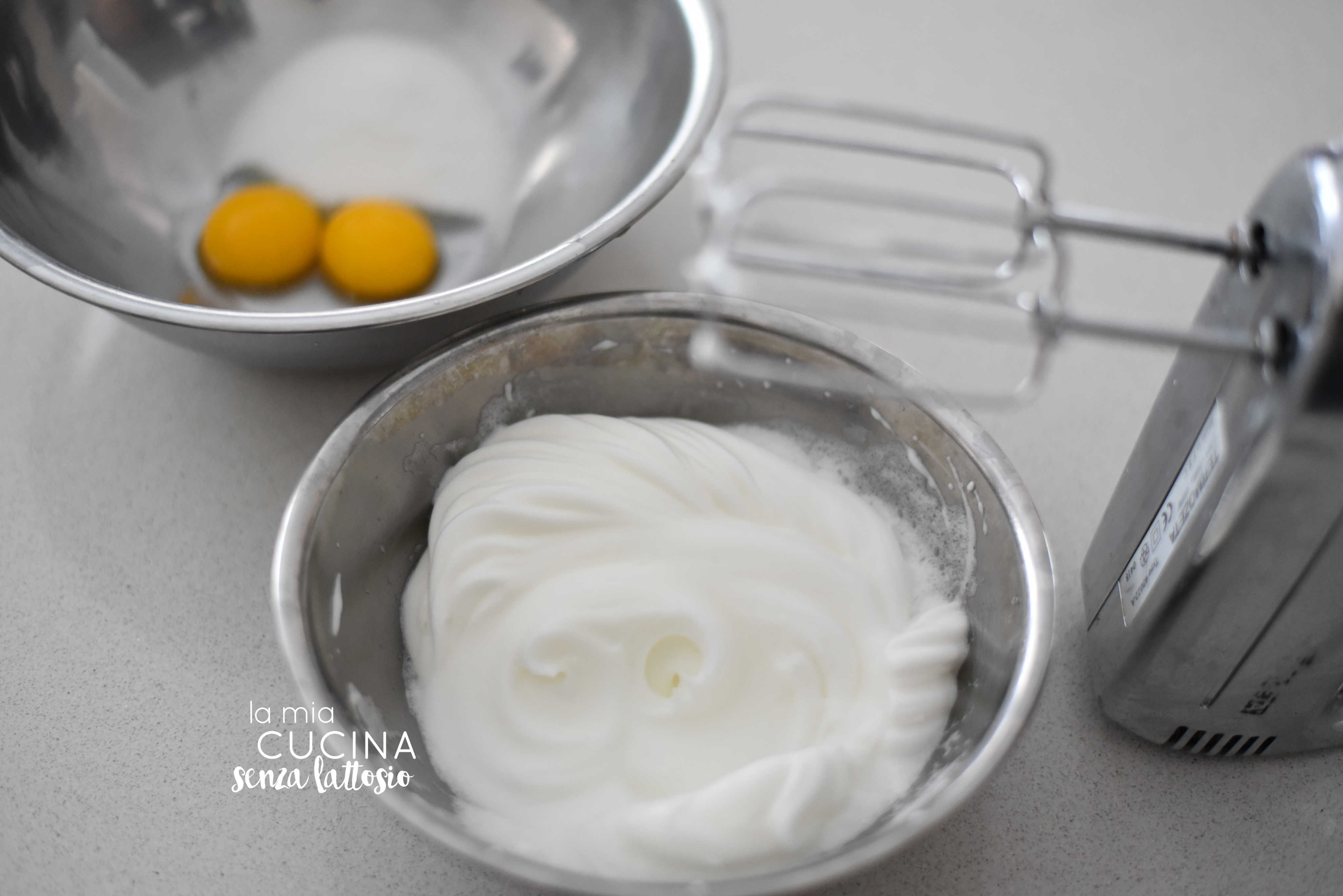 Separare i tuorli dagli albumi e montare gli albumi a neve con un pizzico di sale