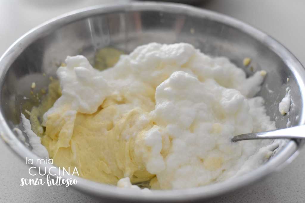 Aggiungere gli albumi montati a neve mescolando delicatamente dal basso verso l’alto