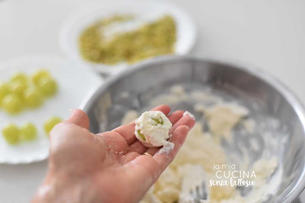 Rotolare la pallina nella granella di pistacchio fino a che tutta la superficie non sia ricoperta di granella