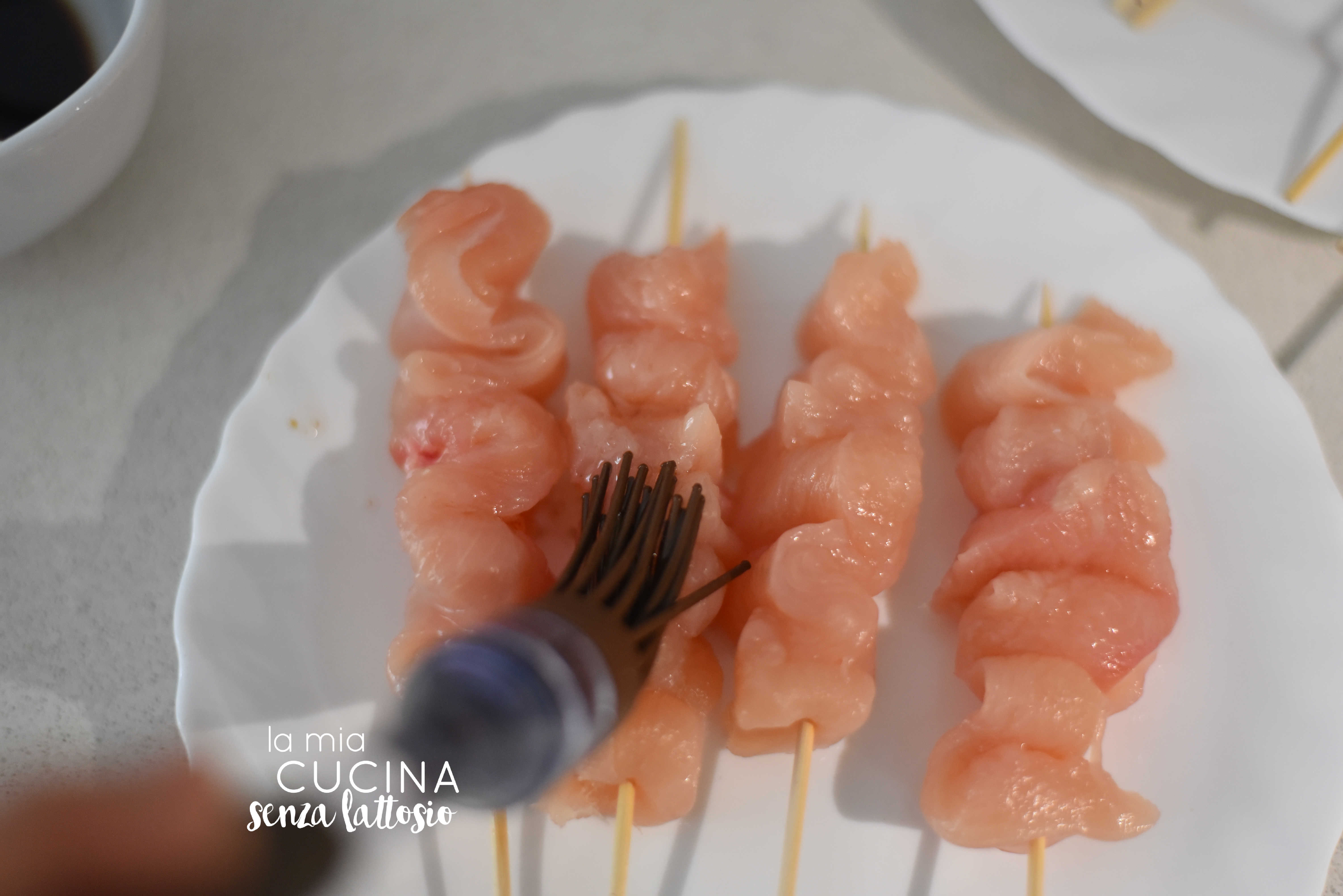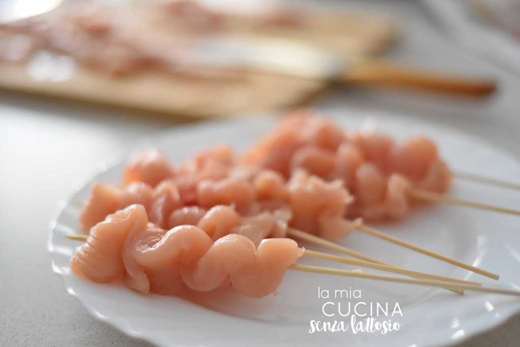 Tagliare il petto di pollo a listarelle ed infilzarle sugli stecchini formando delle onde