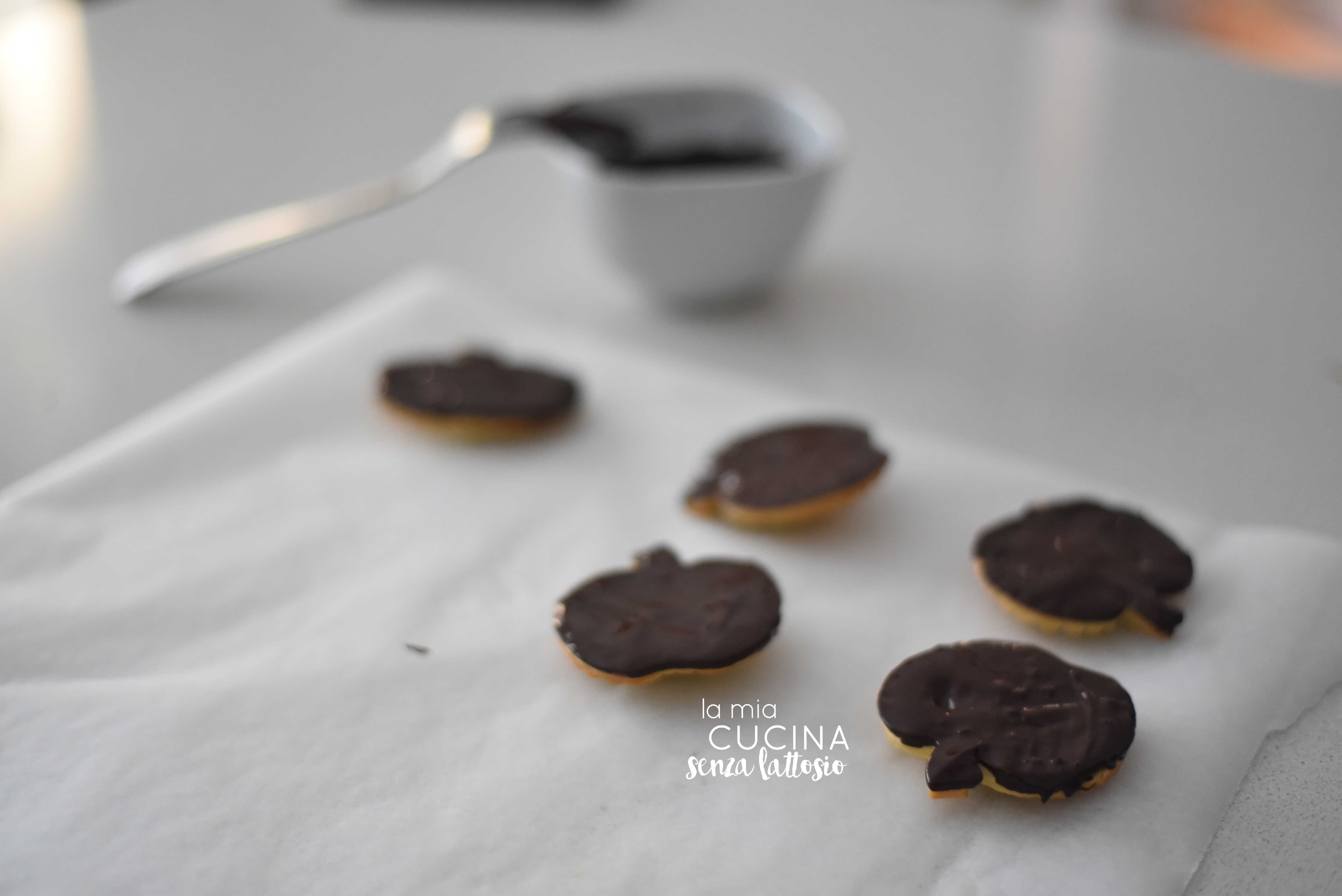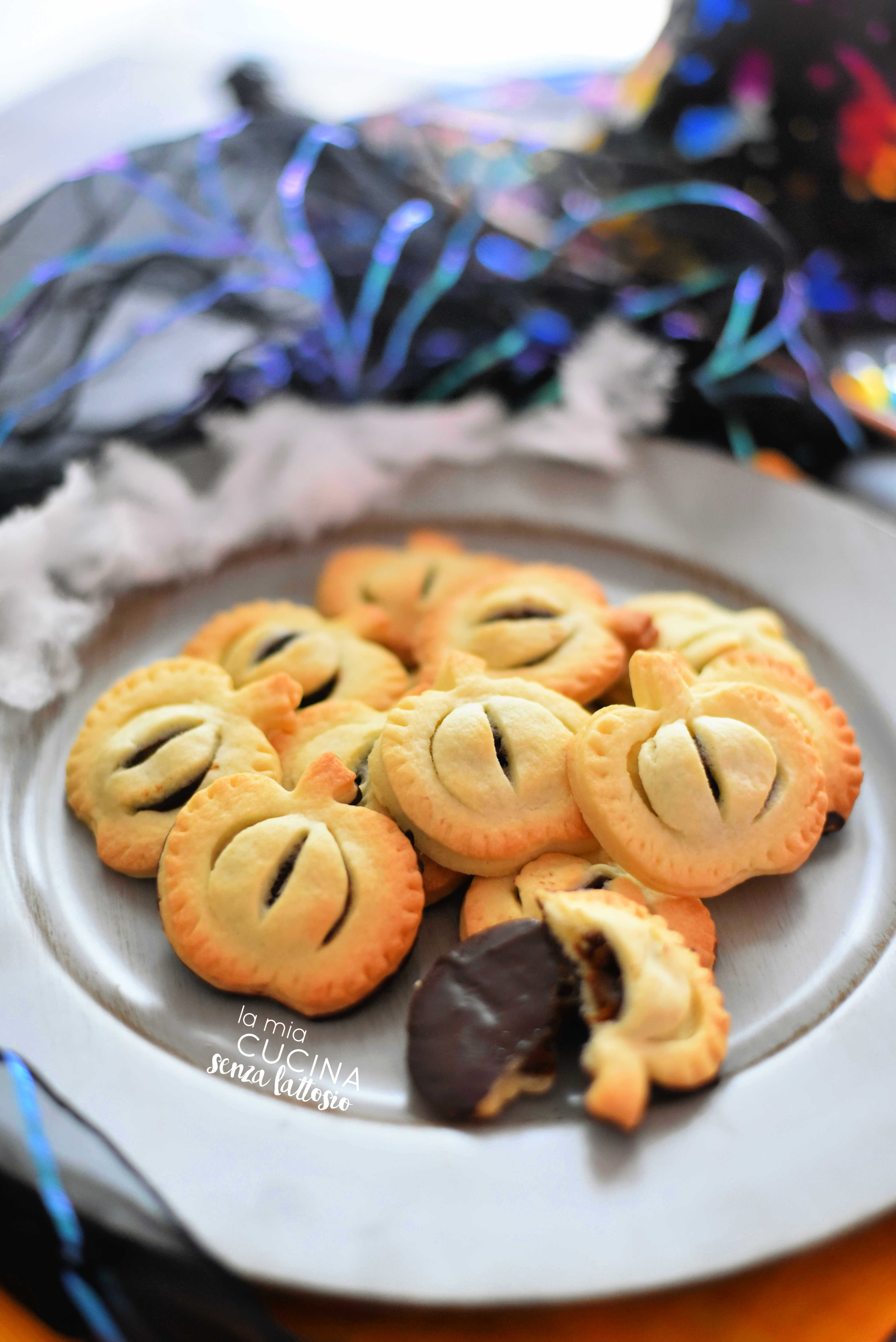 Voi festeggiate Halloween? Se devo essere sincera quando ero piccola nemmeno sapevo esistesse questa festa, mi mascheravo solo a Carnevale, da quando sono mamma però la storia è cambiata, ed ogni anno mi diverto a sorprendere la mia piccola con dei dolcetti mostruosi. Il tempo a disposizione però scarseggia sempre, e devo sempre trovare delle soluzioni superrapide: ho usato quindi una base pronta di frolla (mi trovo molto bene con quella Stuffer) e ho creato dei dolcetti buonissimi. Per renderli più golosi li ho pennellati con il cioccolato fondente, ma è un “di più goloso”, sono buoni anche senza. Di lattosio non ce ne è nemmeno l’ombra, ma il gusto è fenomenale! Se avete più tempo di me potete usare la ricetta della frolla all’olio: successo garantito!