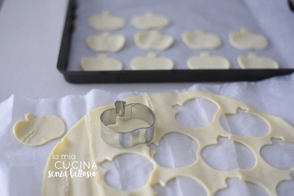Lasciar raffreddare.   Stendere la frolla e ritagliare i biscotti con delle formine sagomate a zucca. Disporre le forme su una teglia rivestita da carta da forno.