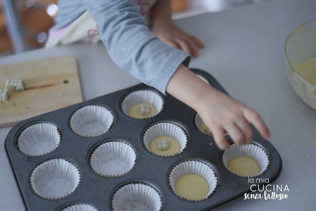 Foderare una teglia da muffin con gli stampini in carta e versare un cucchiaio di impasto in ogni stampino. Porre al centro di ogni stampino un quadratino di cioccolato bianco vegan