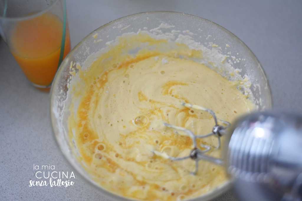 Aggiungere a mano a mano continuando a frullare la farina setacciata, la scorza ed il succo dell’arancia, l’olio ed infine il lievito fino ad ottenere un composto liscio.