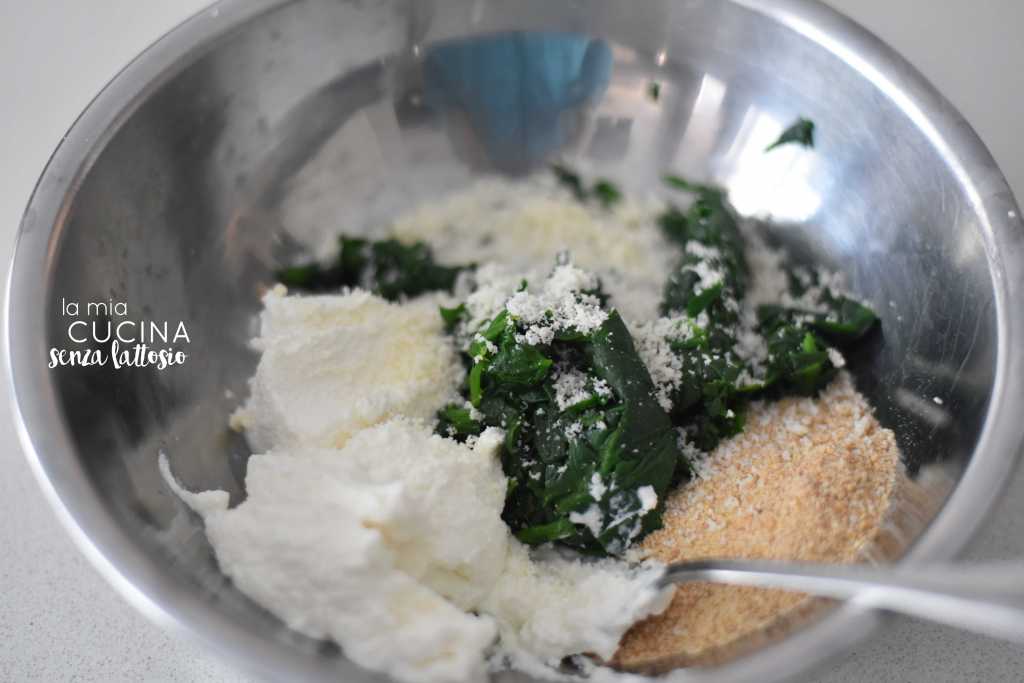 Mettere a bollire gli spinaci in poca acqua salata (10 min se freschi – 5 minuti se surgelati) in acqua salata, scolarli e strizzarli per bene. Unirli alla ricotta, al Parmigiano e al pangrattato, salare ed amalgamare il tutto.
