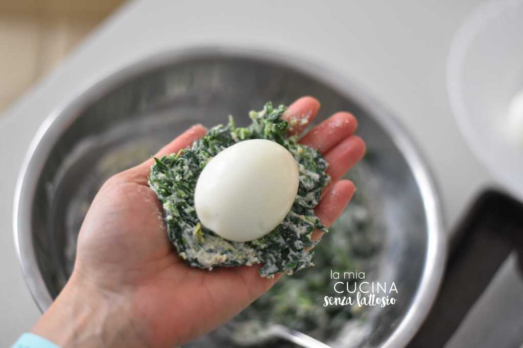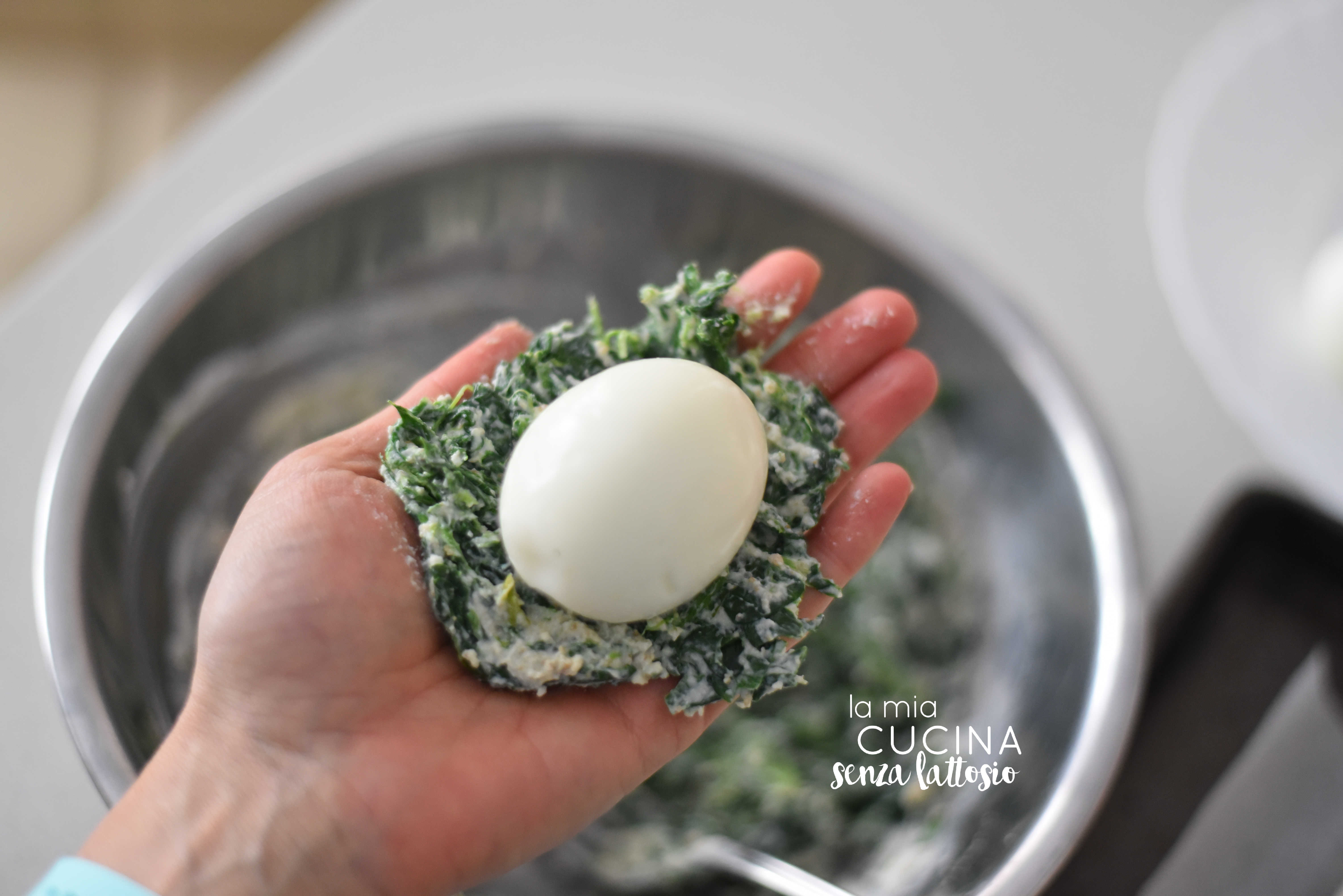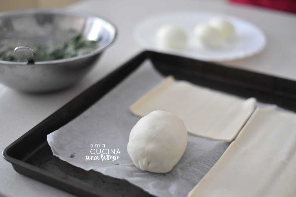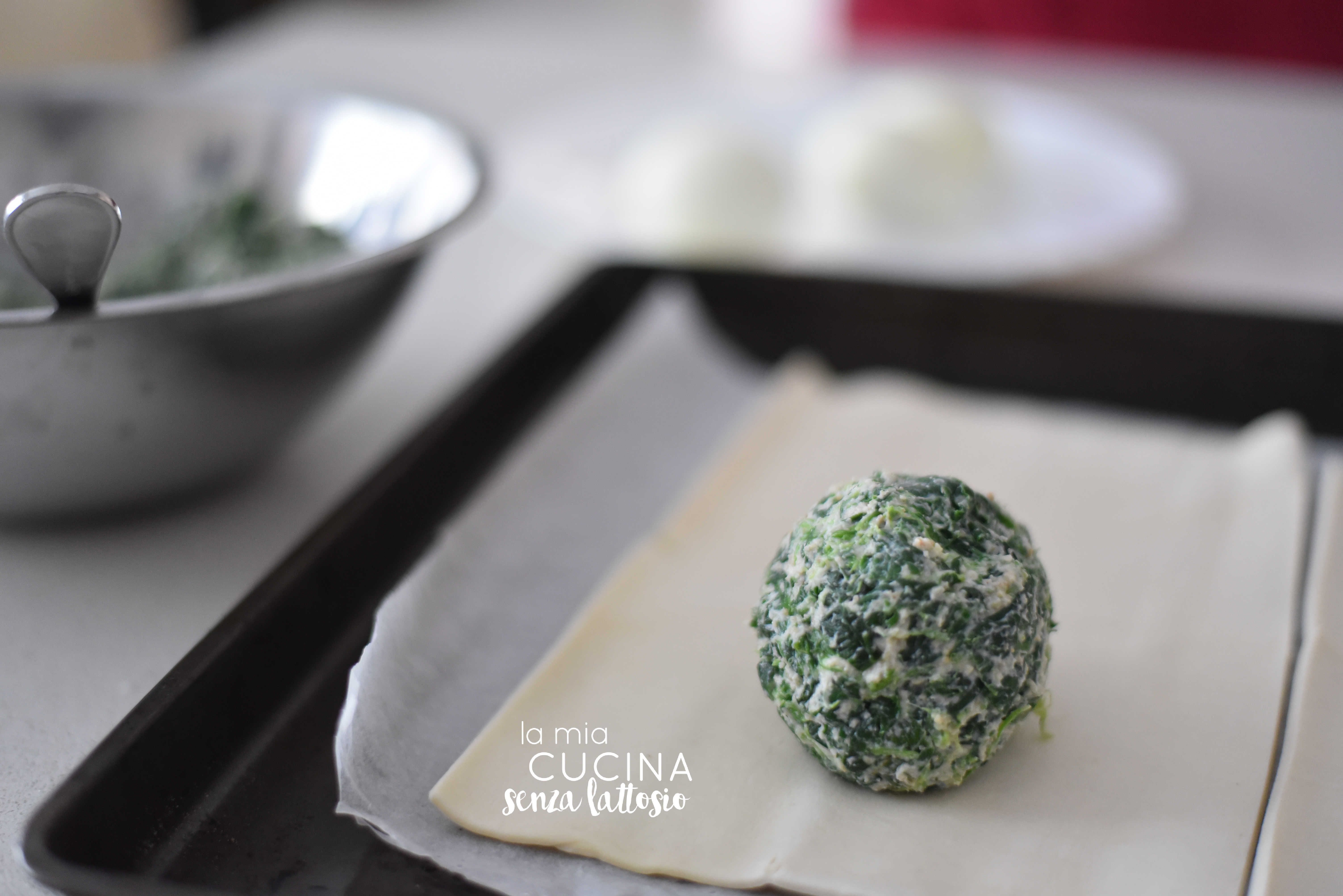 Tagliare la pasta sfoglia in 4. Dividere il composto di ricotta e spinaci in quattro parti, prenderne un quarto nel palmo di una mano, adagiarvi un uovo sopra, e modellare il composto intorno all’uovo coprendone tutte le pareti.