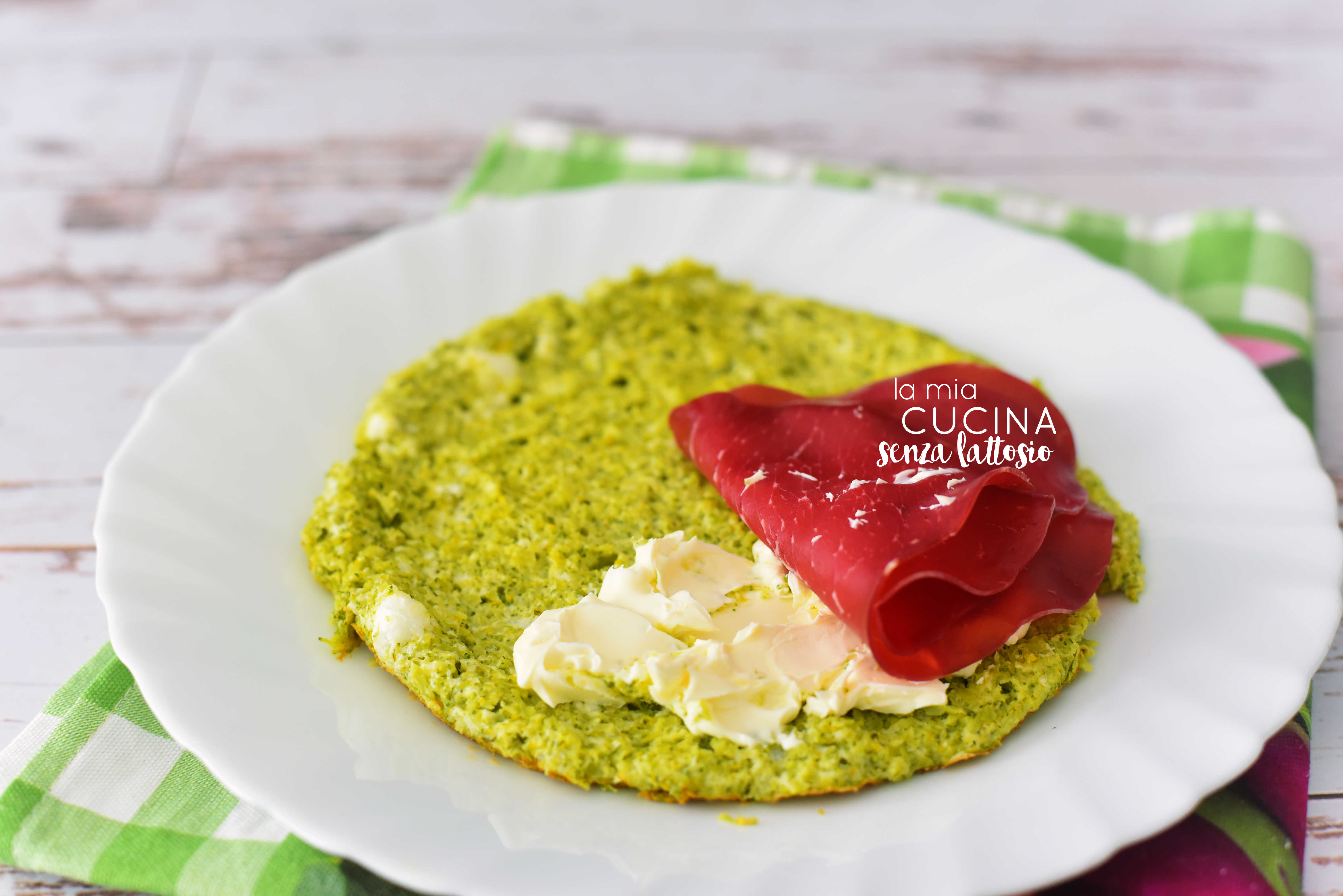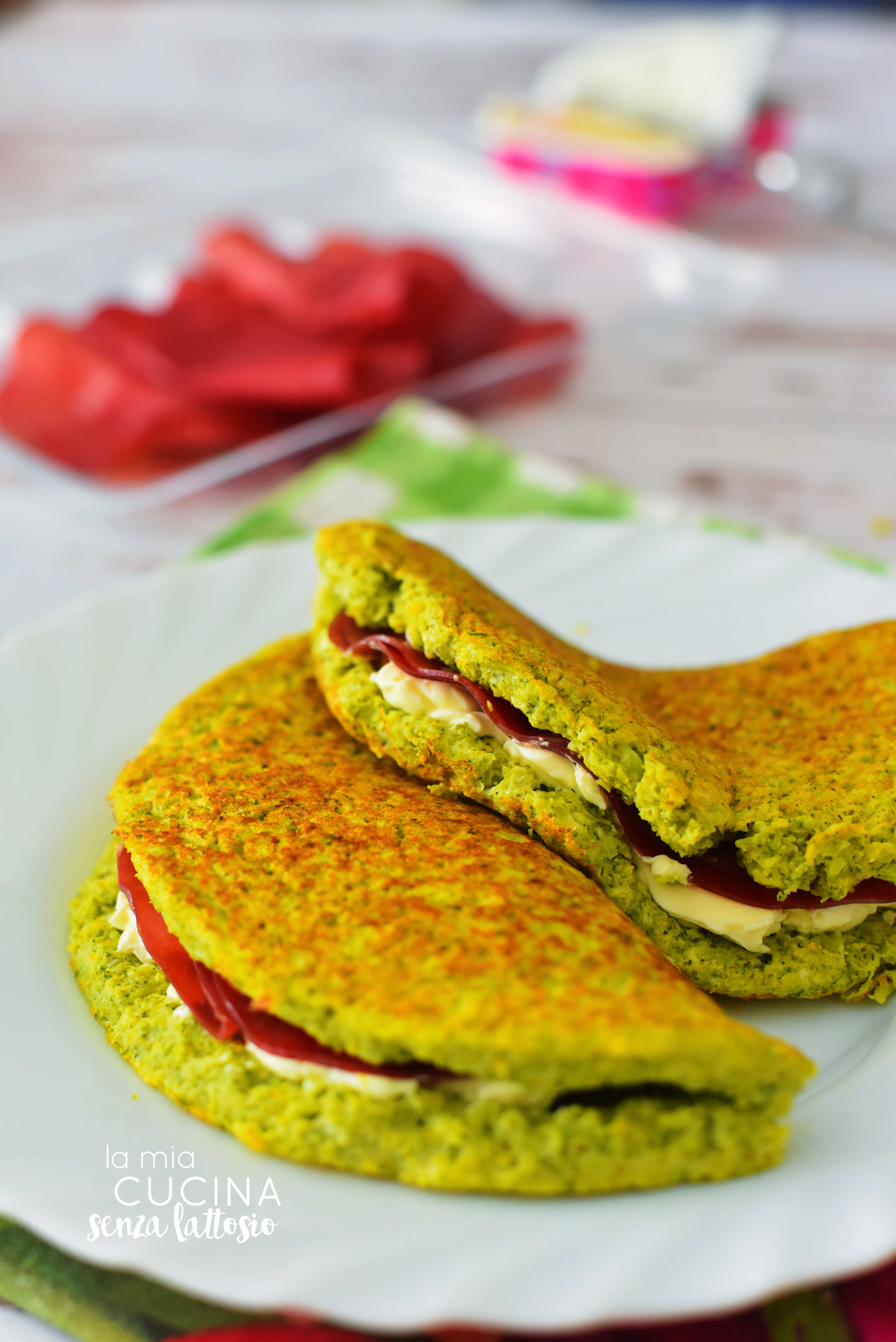 Confesso di aver visto questa ricetta a più riprese sul web, e a furia di trovarmela davanti, mi son decisa a provarla, intrigata dalla preparazione e dal mix di colori. Ovviamente ne ho fatto una mia versione senza lattosio avvalendomi del formaggio spalmabile delattosato, ma direi che potete condire queste crepes come più vi piace: io ho scelto bresaola e formaggio ma saranno in ogni caso un modo molto simpatico per far mangiare i broccoli ai vostri bimbi!