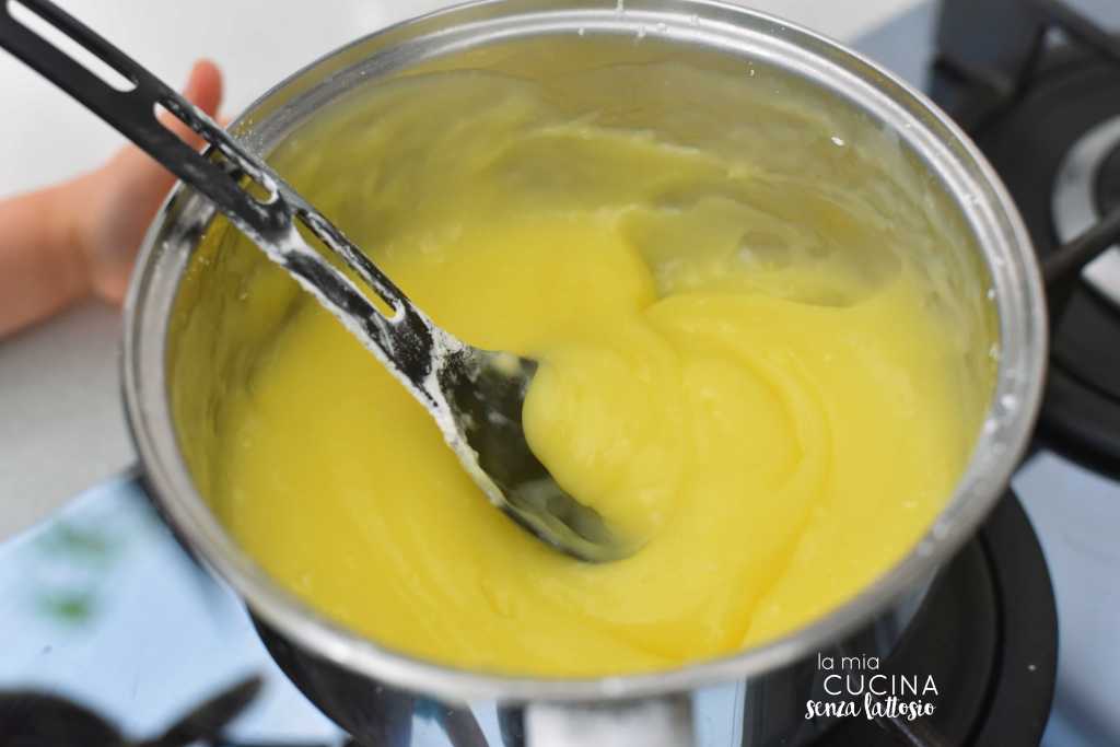 Aggiungere il succo di limone, la scorza grattugiata e l’acqua continuando a mescolare. Trasferire tutto su fiamma dolce e continuare a mescolare fino a che la crema non si addensa.