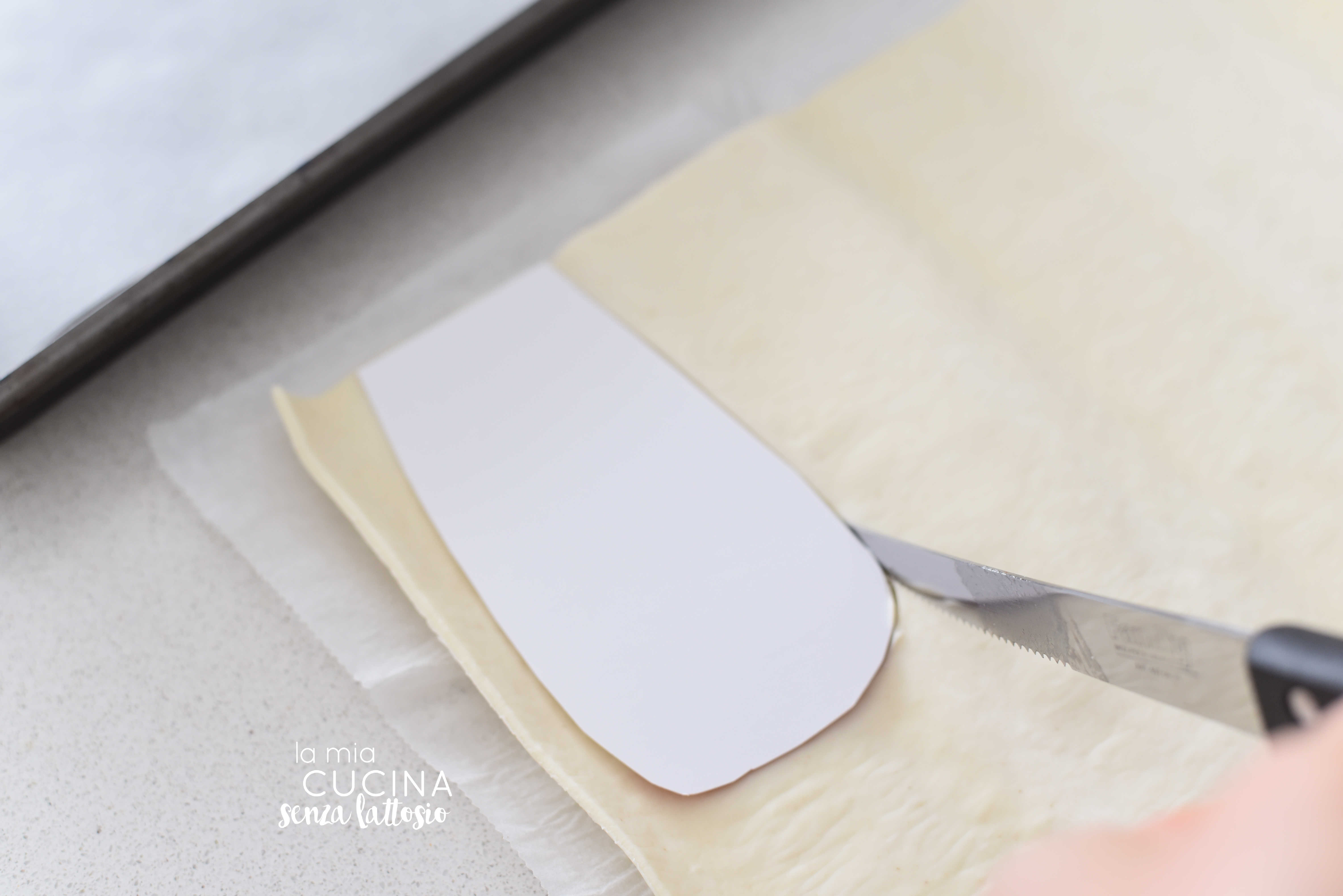 Su di un cartoncino di carta disegnare e ritagliare la forma di una lingua ed usare il cartoncino come stampo per ritagliare le forme di lingua dalla pasta sfoglia.