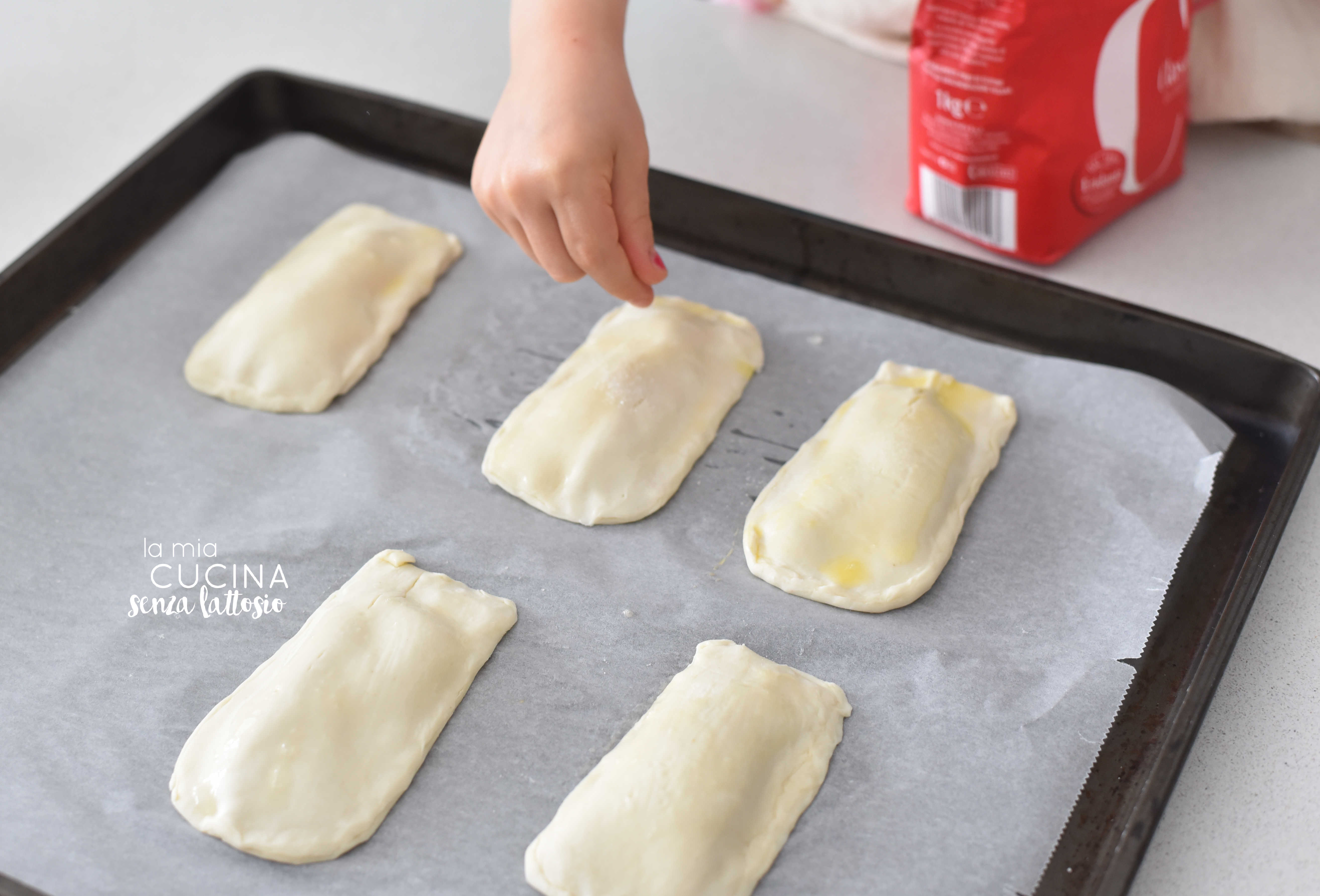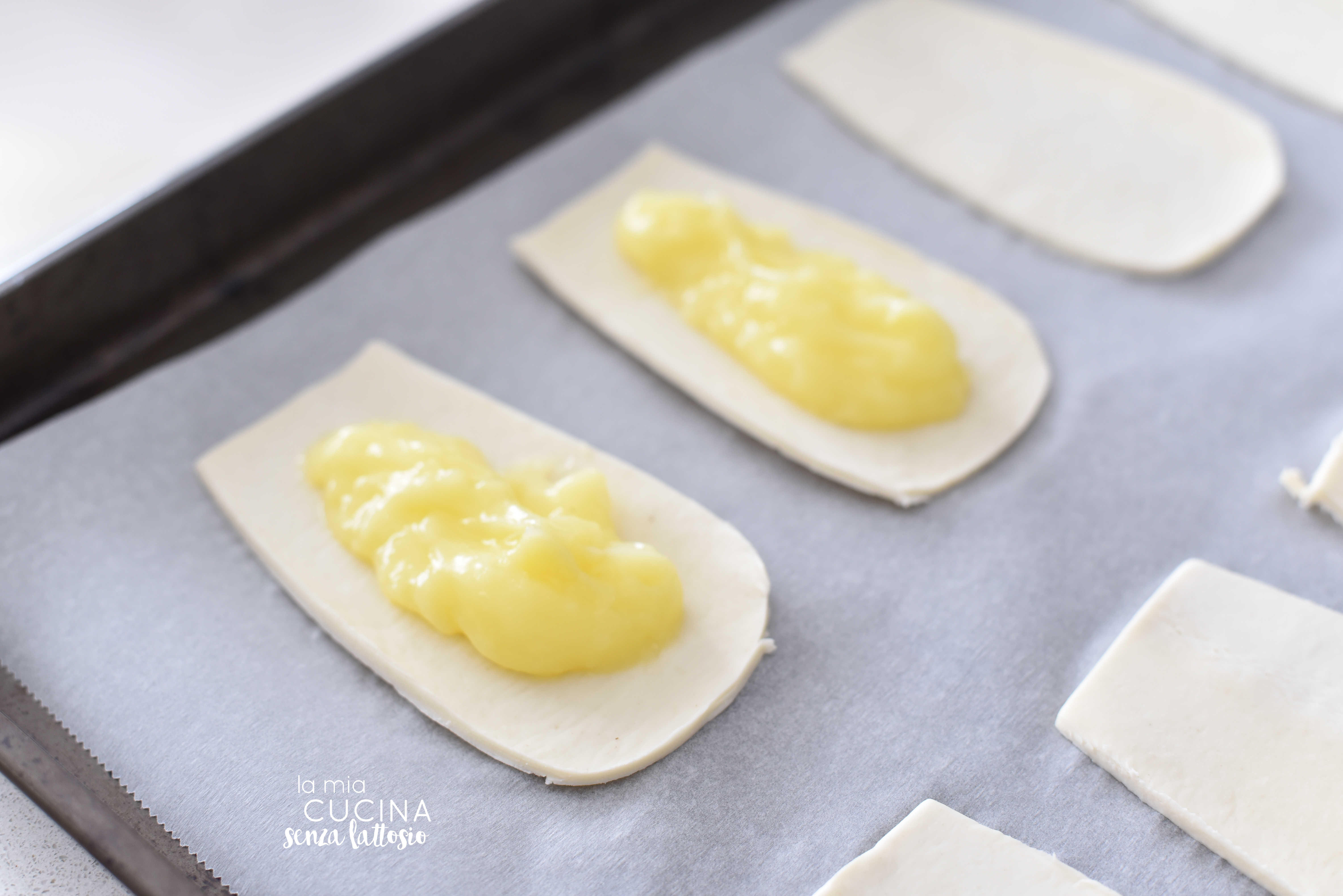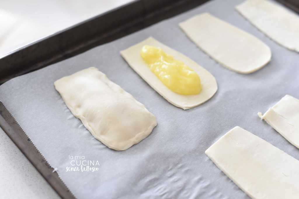 Farcire la metà delle lingue di pasta sfoglia con un cucchiaio di crema al limone  e ricoprire con un’altra lingua di pasta sfoglia serrando bene i bordi.