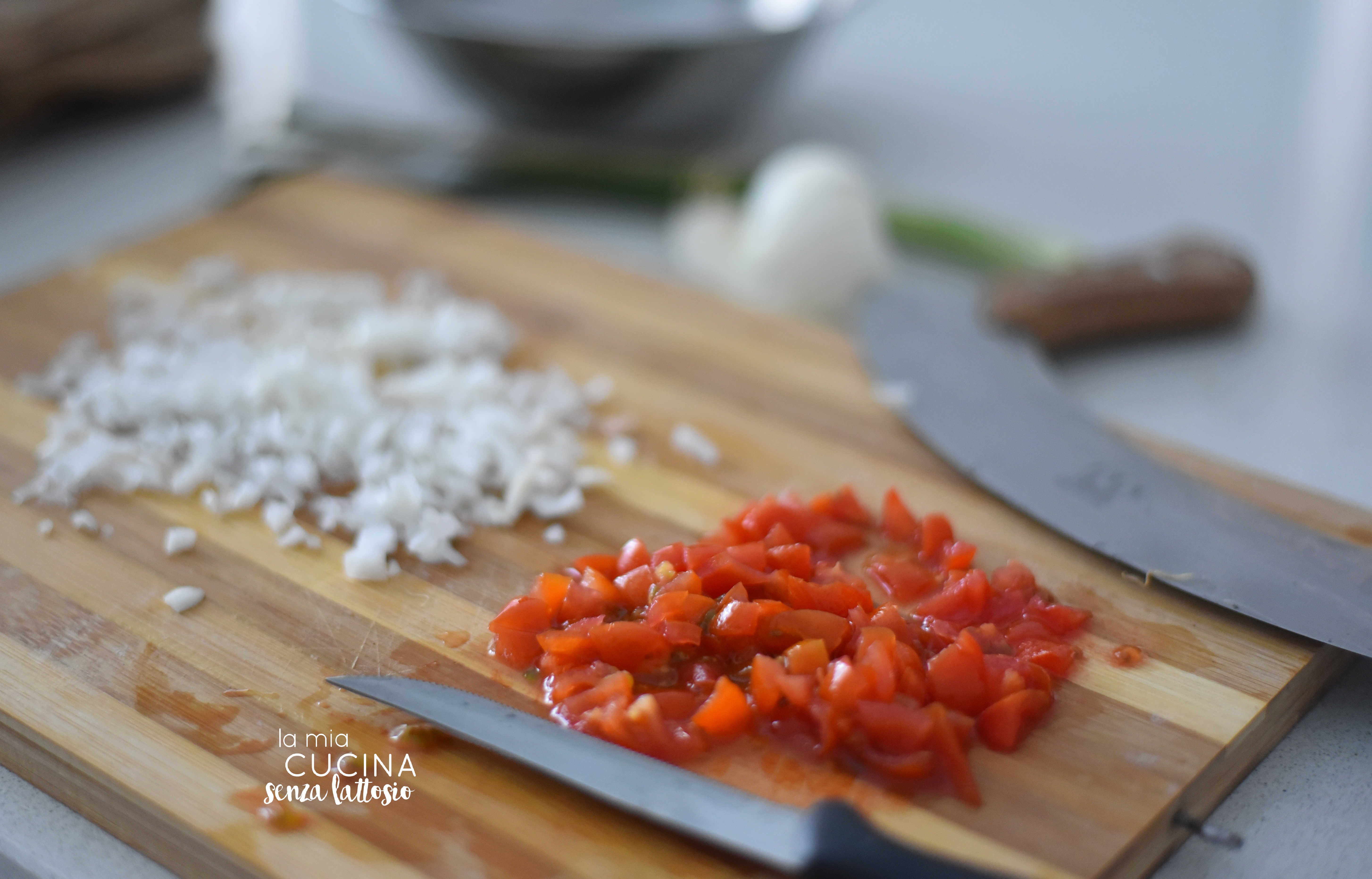 Sminuzzare il cipollotto con la mezzaluna e tagliare i pomodorini a cubotti molto piccoli