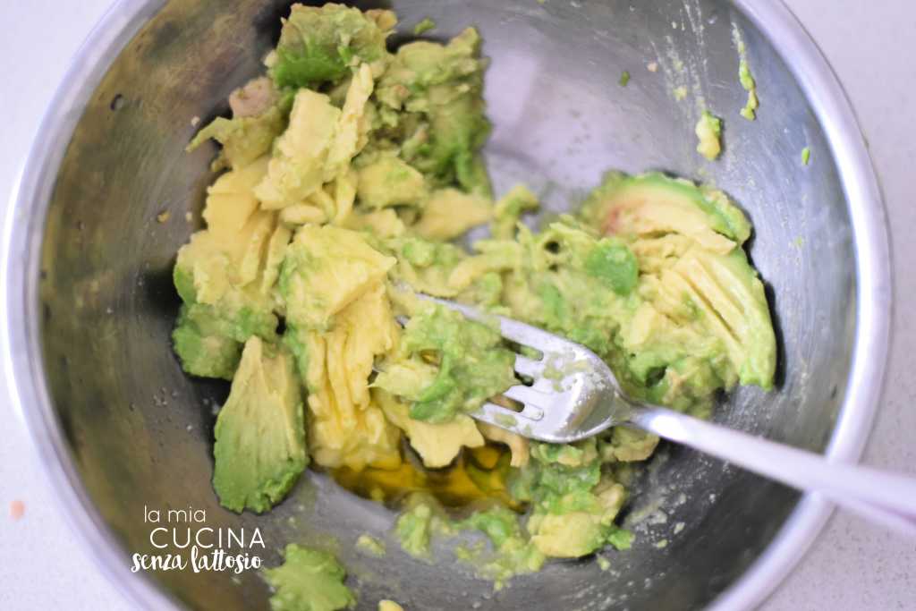 Dividere in due l’avocado, rimuoverne la polpa e schiacciarla insieme al sale, all’olio e al succo di lime (o limone)