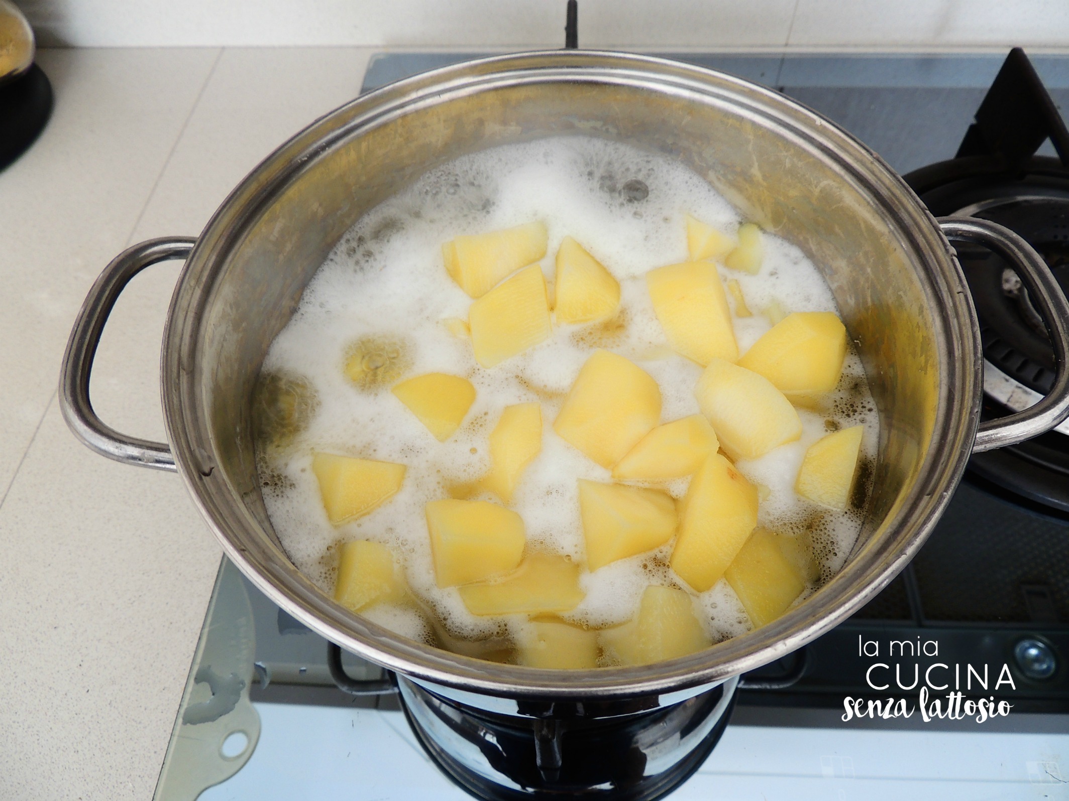 Sbucciare le patate, tagliarle a tocchetti e farle bollire in poca acqua per 15 min.