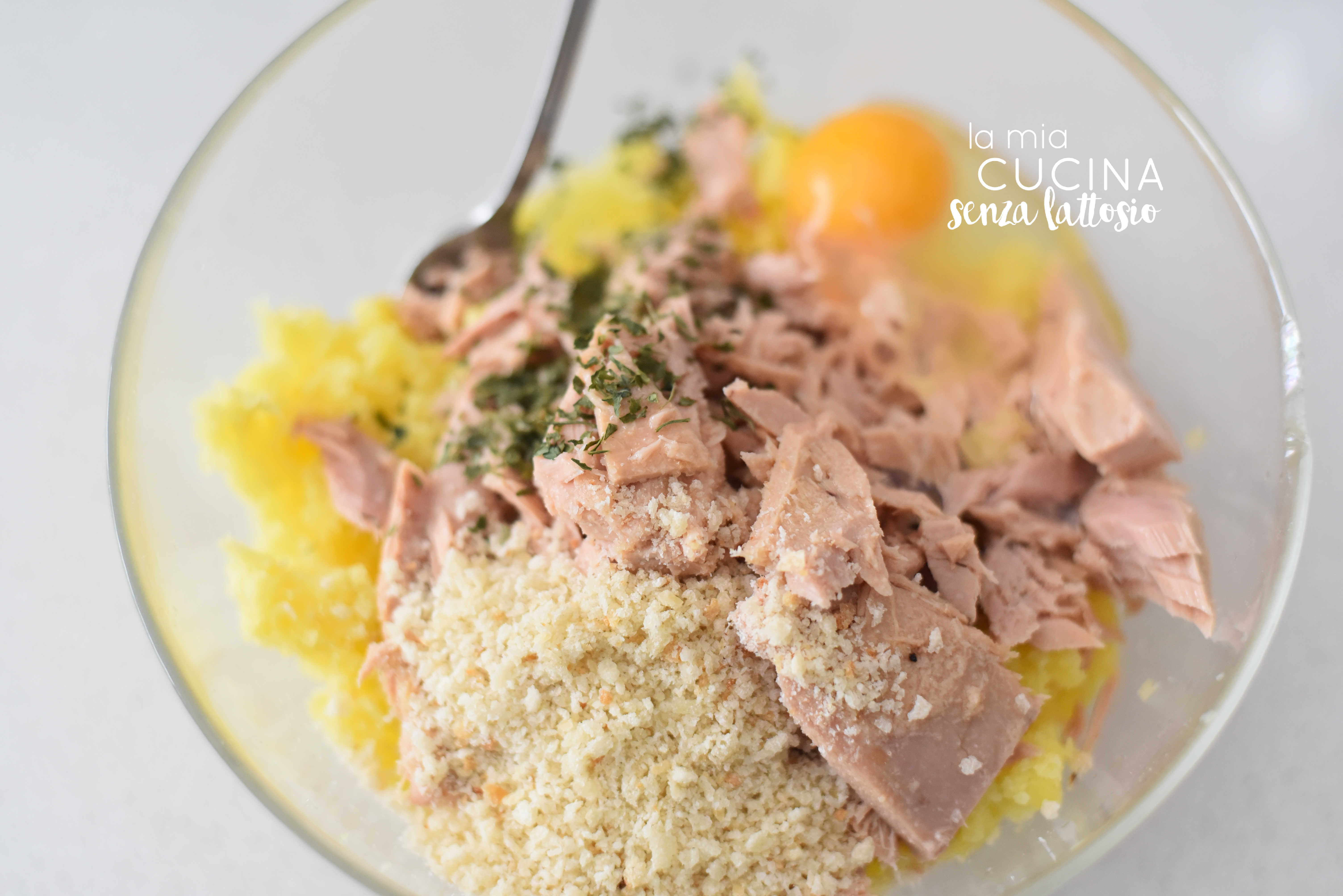 In un contenitore schiacciare le patate, aggiungere il tonno, l’uovo, il formaggio, il prezzemolo ed il sale ed amalgamare il tutto fino a che il composto non diventa modellabile con le mani (se necessario aggiungere a poco a poco del pan grattato).